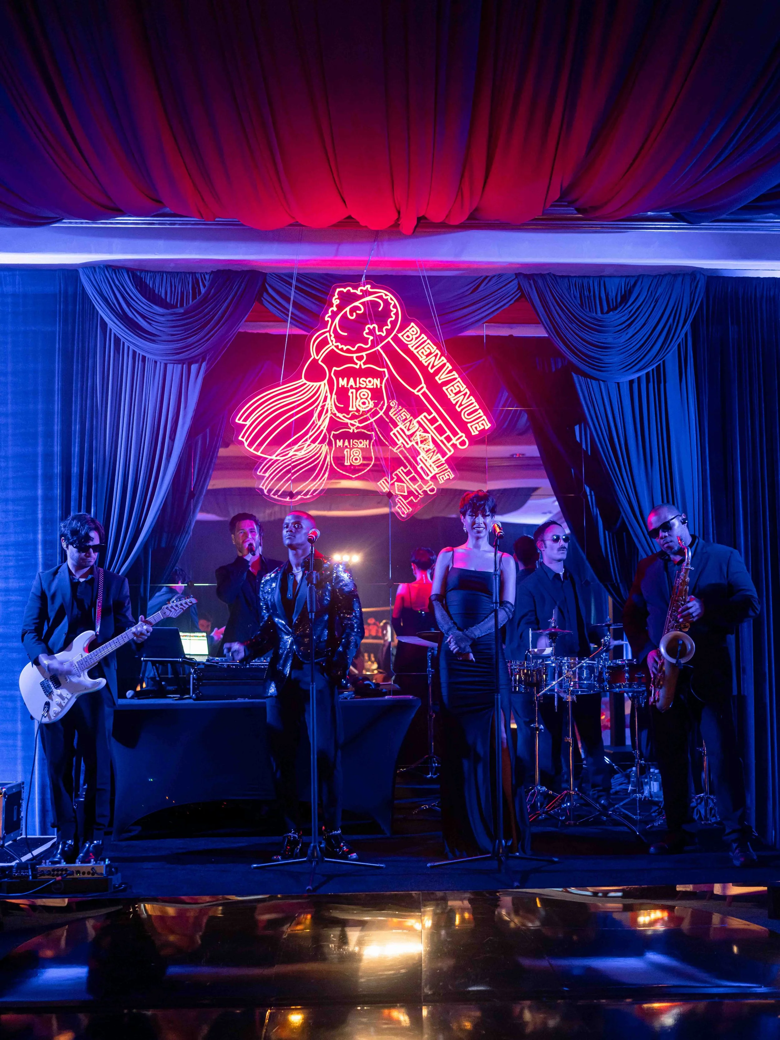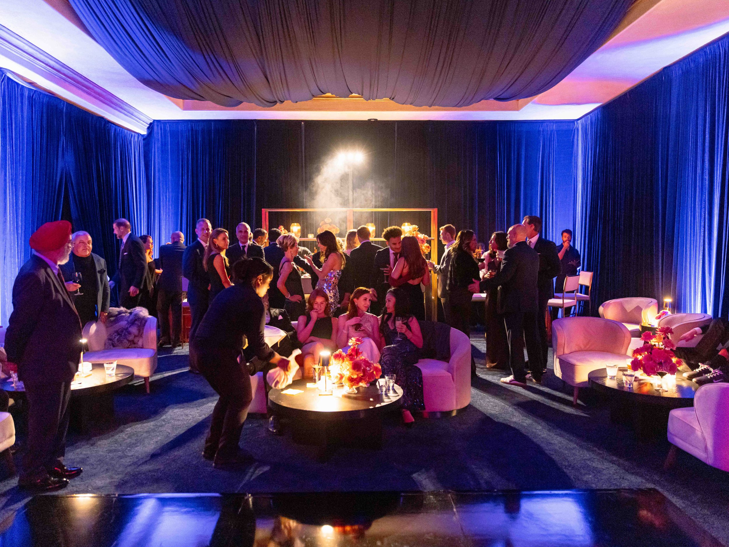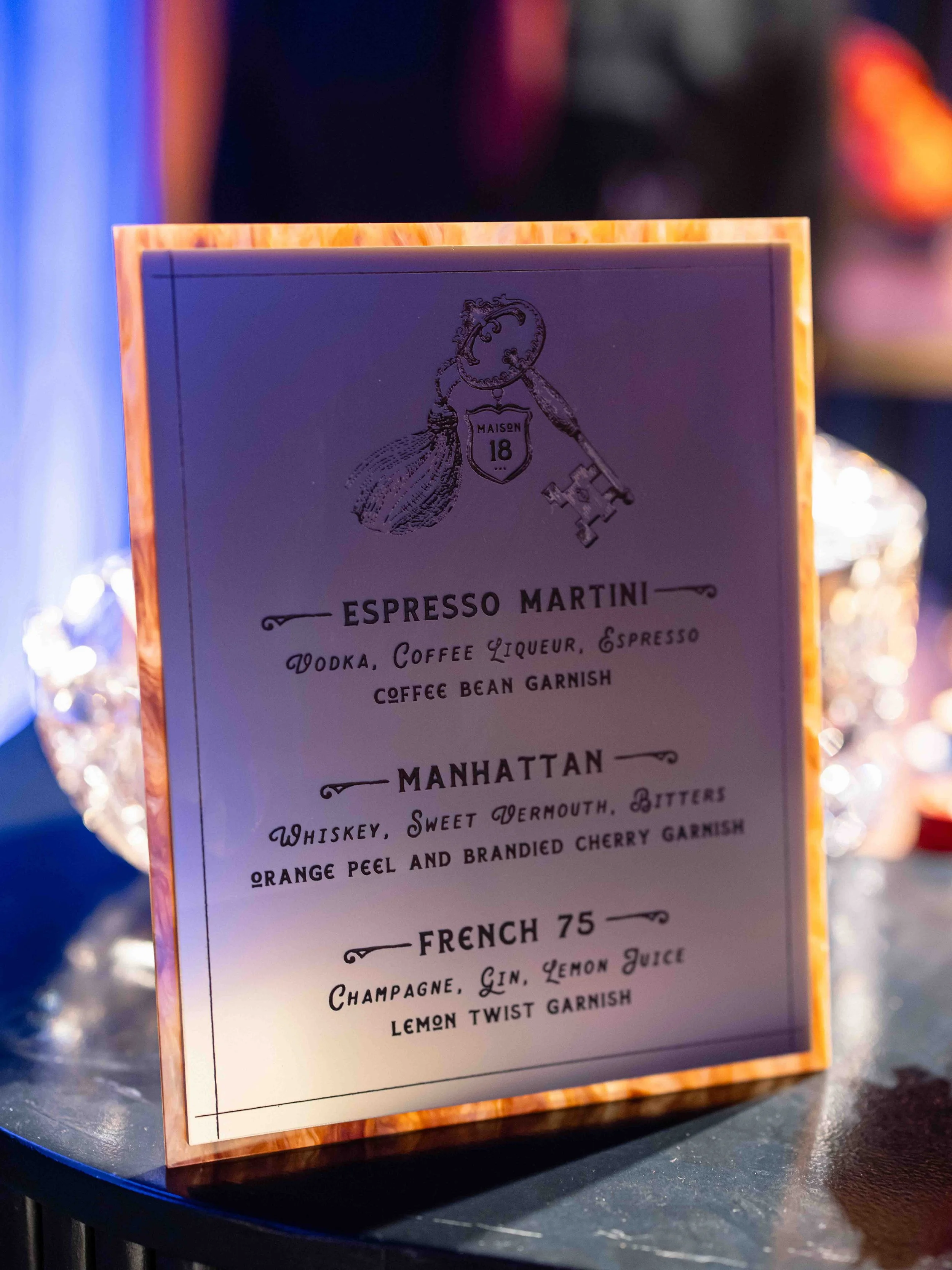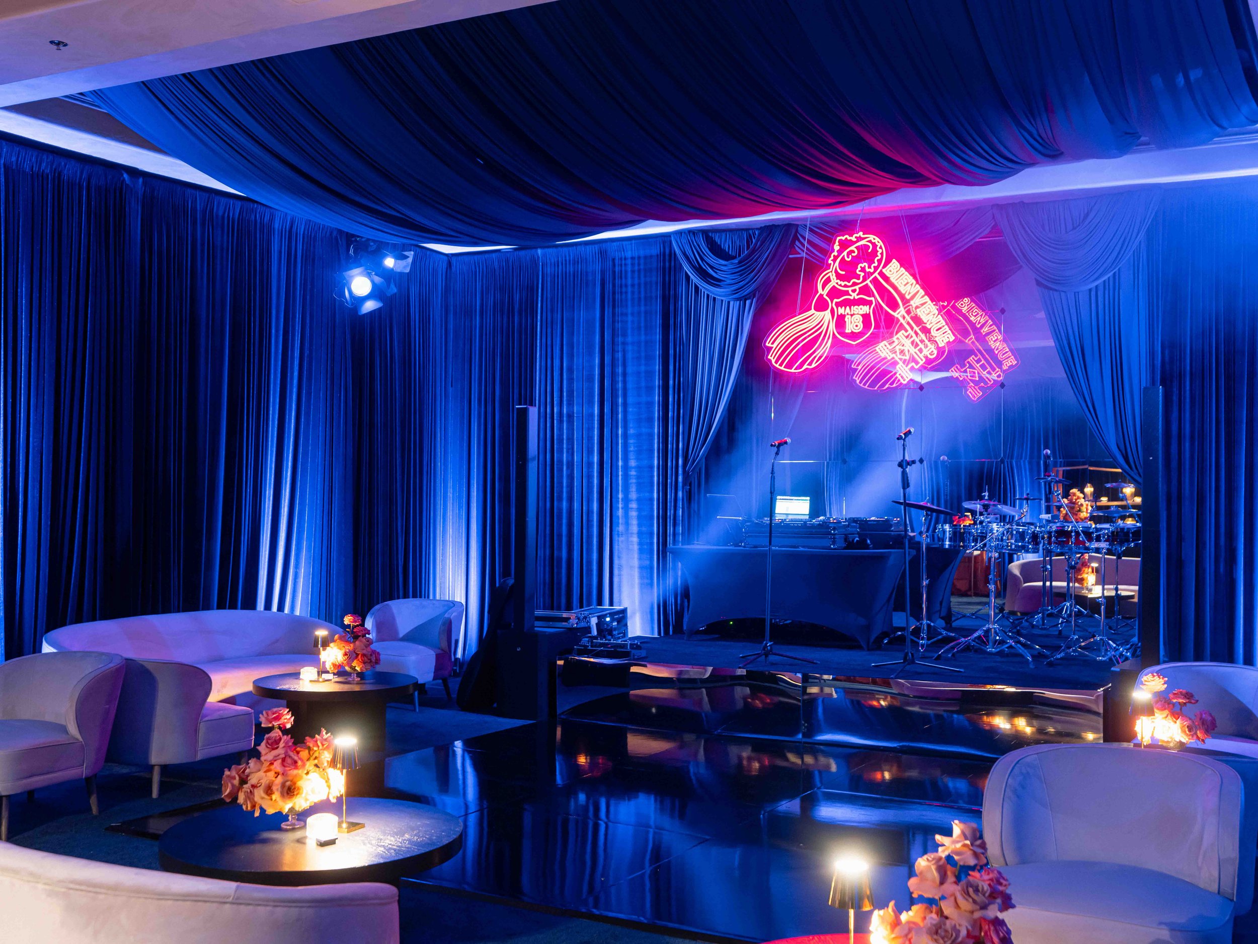 After their dinner reception, Dominique and Steven surprised their guests with a hidden speak-easy with a hidden entrance we built in the ballroom with the logo projected onto the floor as guests entered. The vibe inspired by Stevens history in New York aimed at creating a sultry, lounge space. They chose to name it “Maison 18” as homage to their wedding date. We designed a custom LED sign to hang over the stage, and used the key motif throughout the event in matchboxes, cocktail napkins and bar menus. We draped the entire room in a blue velvet and covered the existing carpeting in a dark blue.