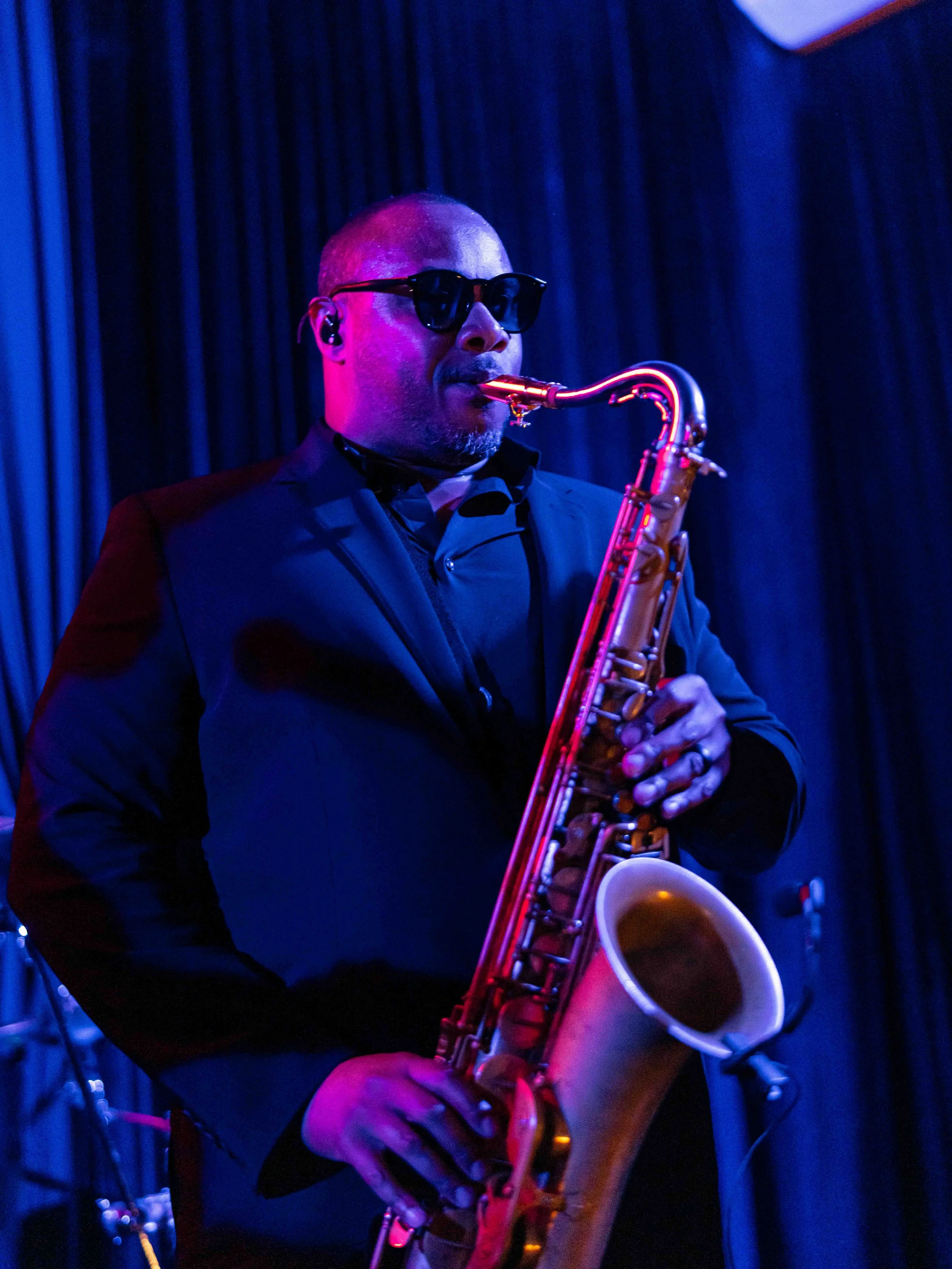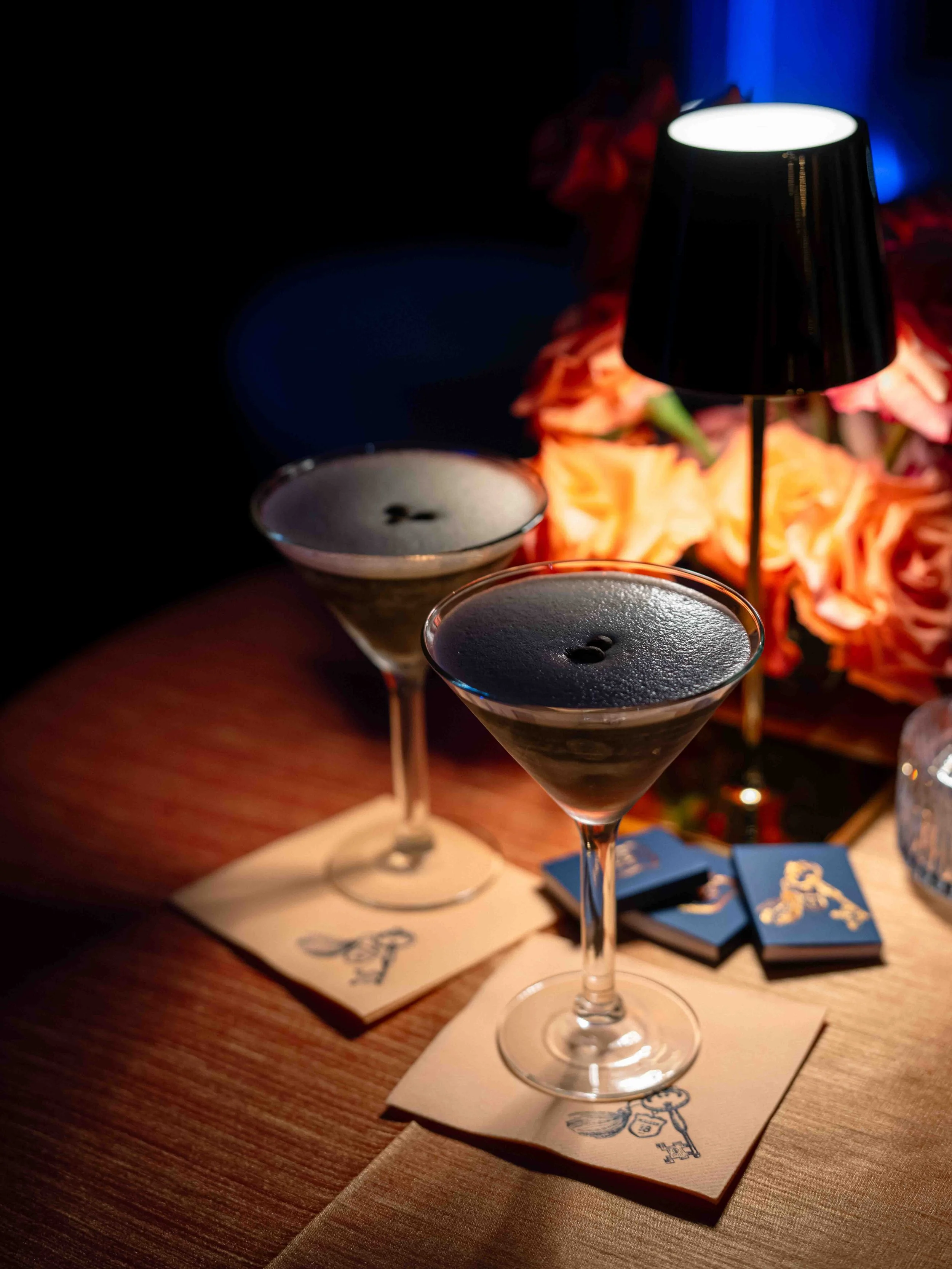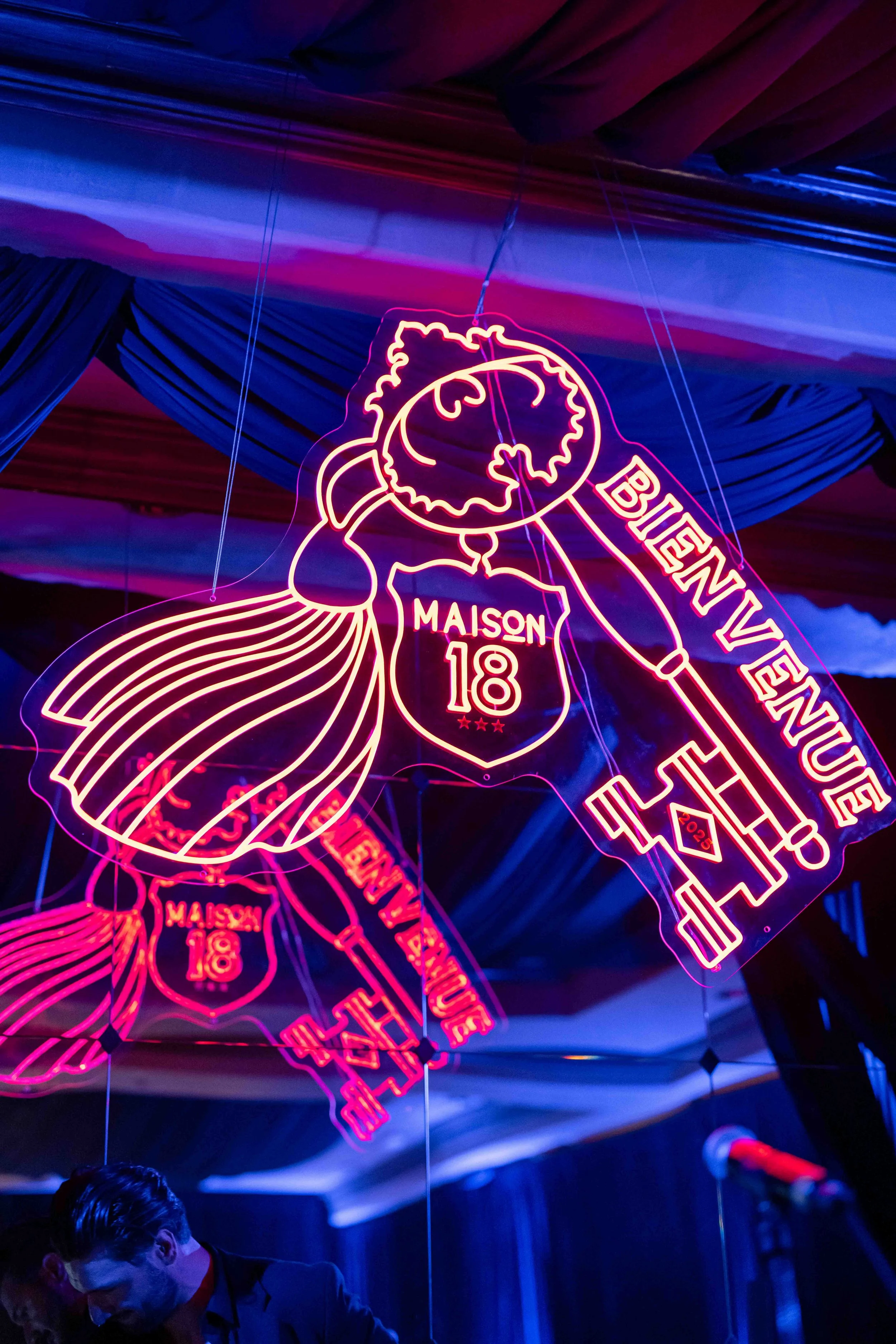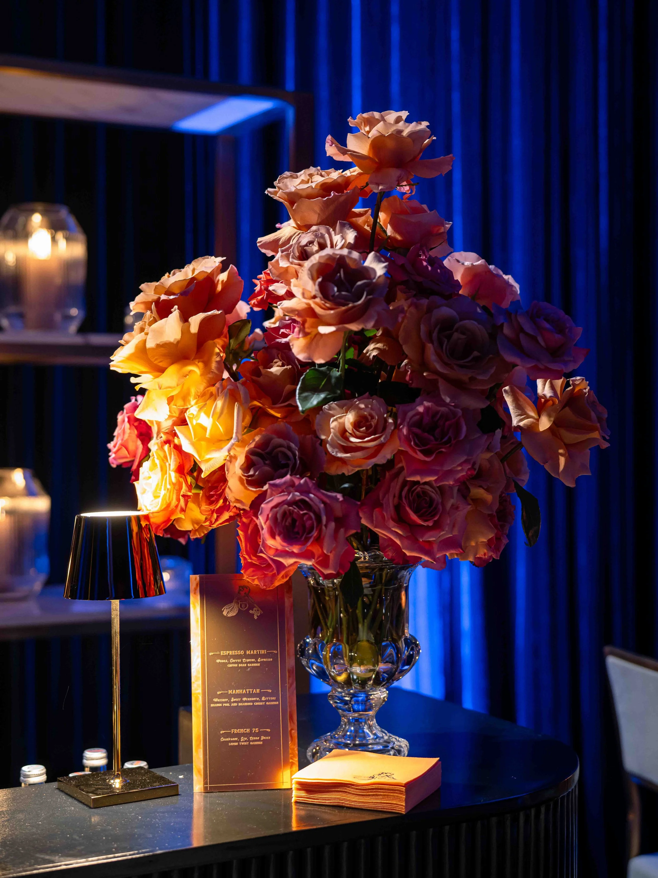 After their dinner reception, Dominique and Steven surprised their guests with a hidden speak-easy with a hidden entrance we built in the ballroom with the logo projected onto the floor as guests entered. The vibe inspired by Stevens history in New York aimed at creating a sultry, lounge space. They chose to name it “Maison 18” as homage to their wedding date. We designed a custom LED sign to hang over the stage, and used the key motif throughout the event in matchboxes, cocktail napkins and bar menus. We draped the entire room in a blue velvet and covered the existing carpeting in a dark blue.